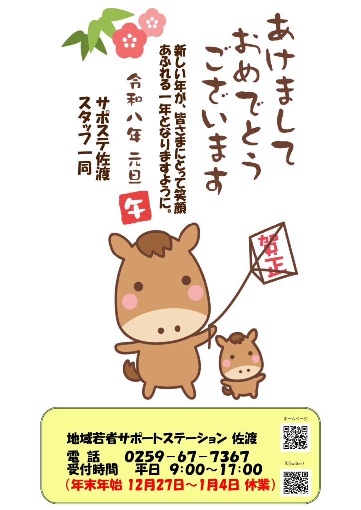 お知らせ 【佐渡】 新年のご挨拶 新年あけましておめでとうございます昨年は、みなさんにご利用いただきありがとうございました。本年も色々なお話をして一緒に考えていきましょう。 前のページへ 一覧へ戻る 次のページへ