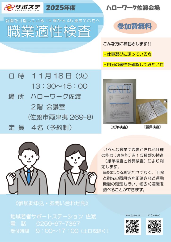 お知らせ 【佐渡】11月 職業適性検査(ハローワーク佐渡会場) 職業適性検査11月開催のお知らせです。「ハローワーク佐渡」で行います。日時 11月18日(火)時間 13:30~15:00会場 ハローワーク佐渡 2階会議室筆記検査と器具検査を実施します。検査名 厚生労働省編一般職業適性検査(GATB)仕事を探していく中で、どのような職業や分野に向いているのか迷っている方、どんな仕事をしたらいいか分からず困っている方に、検査を通して客観的に職業適性を見つめ、職業選択の参考としていただくものです。開催案内はこちらです↓↓ 前のページへ 一覧へ戻る