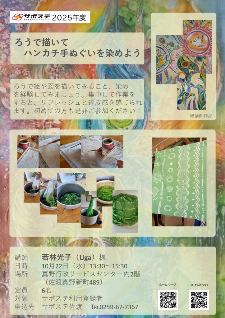 お知らせ 【佐渡】10月 ろうけつ染めでハンカチ手ぬぐいを作ろう 10月のコミュニケーション講座の案内です。ロウで描いてハンカチ手ぬぐいを染める経験が出来ます。初めての方でも挑戦しやすい講座となっています。ものづくりの経験を是非してみましょう。 講座の開催案内は下のチラシをご確認ください↓↓ 前のページへ 一覧へ戻る 次のページへ