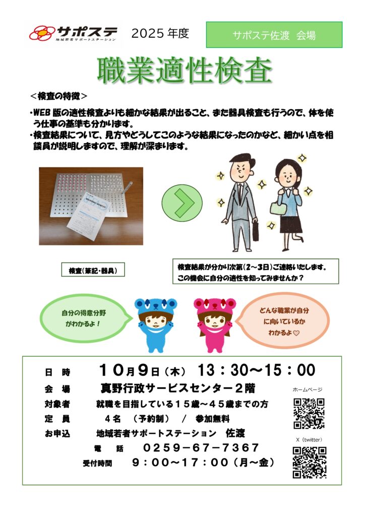 お知らせ 【佐渡】10月 職業適性検査(サポステ佐渡会場) 職業適性検査10月開催のお知らせです。 日時 10月9日(木) 時間 13:30~15:00会場 真野行政サービスセンター2階 筆記検査と器具検査を実施します。検査名 厚生労働省編一般職業適性検査(GATB)仕事を探していく中で、どのような職業や分野に向いているのか迷っている方、どんな仕事をしたらいいか分からず困っている方に、検査を通して客観的に職業適性を見つめ、職業選択の参考としていただくものです。 開催案内はこちらです↓↓ 前のページへ 一覧へ戻る 次のページへ
