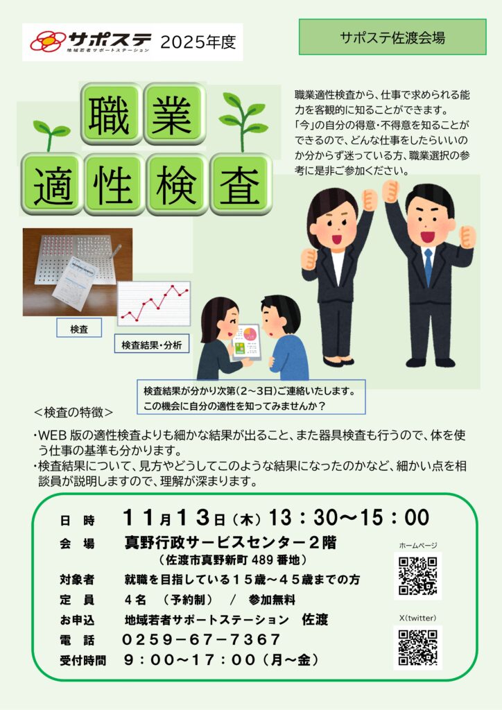 【佐渡】11月職業適性検査(サポステ佐渡会場)