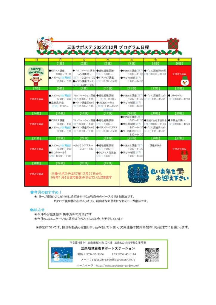 プログラム案内 2025年12月プログラム日程表 Warning: Undefined array key "file" in /home/is1cojp6/saposute-sanjo.com/public_html/wp2025/wp-includes/media.php on line 1774 2025年12月のプログラム日程表です。よろしくお願いいたします^^ 前のページへ 一覧へ戻る 次のページへ